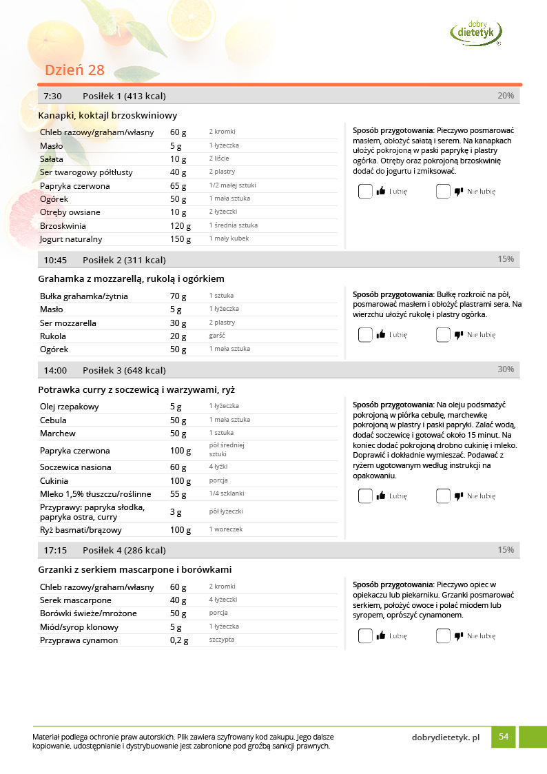 • w formie precyzyjnych jadłospisów wielodniowych (na każdy dzień miesiąca jest opracowany osobny jadłospis). Tutaj nie musisz zastanawiać się co zjeść każdego dnia, gdyż będziesz mieć dokładnie wszystko rozplanowane.