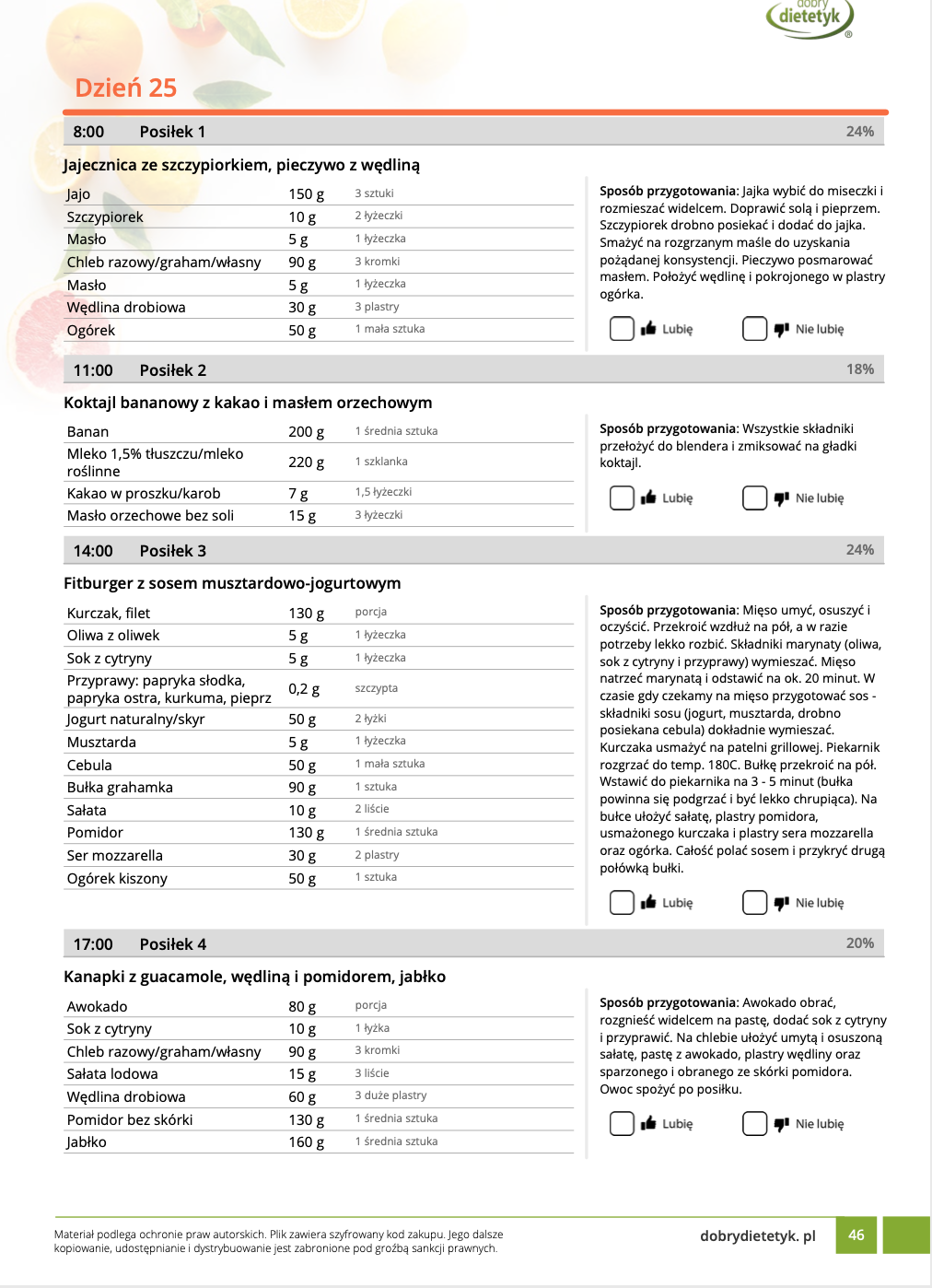 • w formie propozycji posiłków (zamiast pojedynczych jadłospisów jednodniowych, przygotowano propozycje kilku propozycji dań na każdy posiłek). Tutaj nie uzależniamy Cię od tego jakie masz np. w danym dniu zjeść śniadanie czy obiad, tylko sam wybierasz sobie ulubione danie z kilku przedstawionych przez nas propozycji.